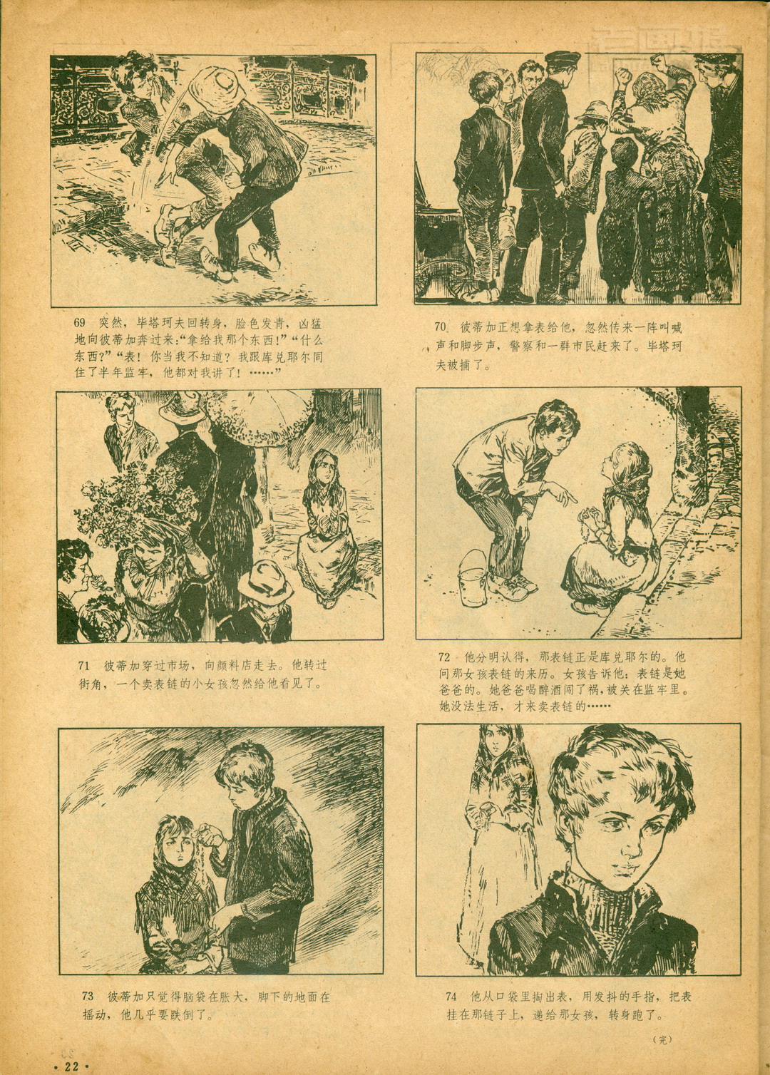 连环画 《表(续)》 第6页 原著:[苏联]班台莱耶夫 编文:董青冬 绘画:华三川 连环画报 1979年第8期 老画报网藏书扫描制作 转载请注明出处 这个故事上期说到主人公流浪儿彼蒂加因在市场 上 偷 吃 蛋饼,被警察局拘留,送进了少年教养院。在教养院里,他生活得很好,但他担心从拘留所一个醉汉--库兑耶尔那里骗来的一块金表,带在身上不保险,就趁一天傍晚,把它埋到教养院中园的地底下。 1 2 3 4 5 6 目录 |<< < 上一页 下一页 > >>| 表(续) < 上一页下一页 >