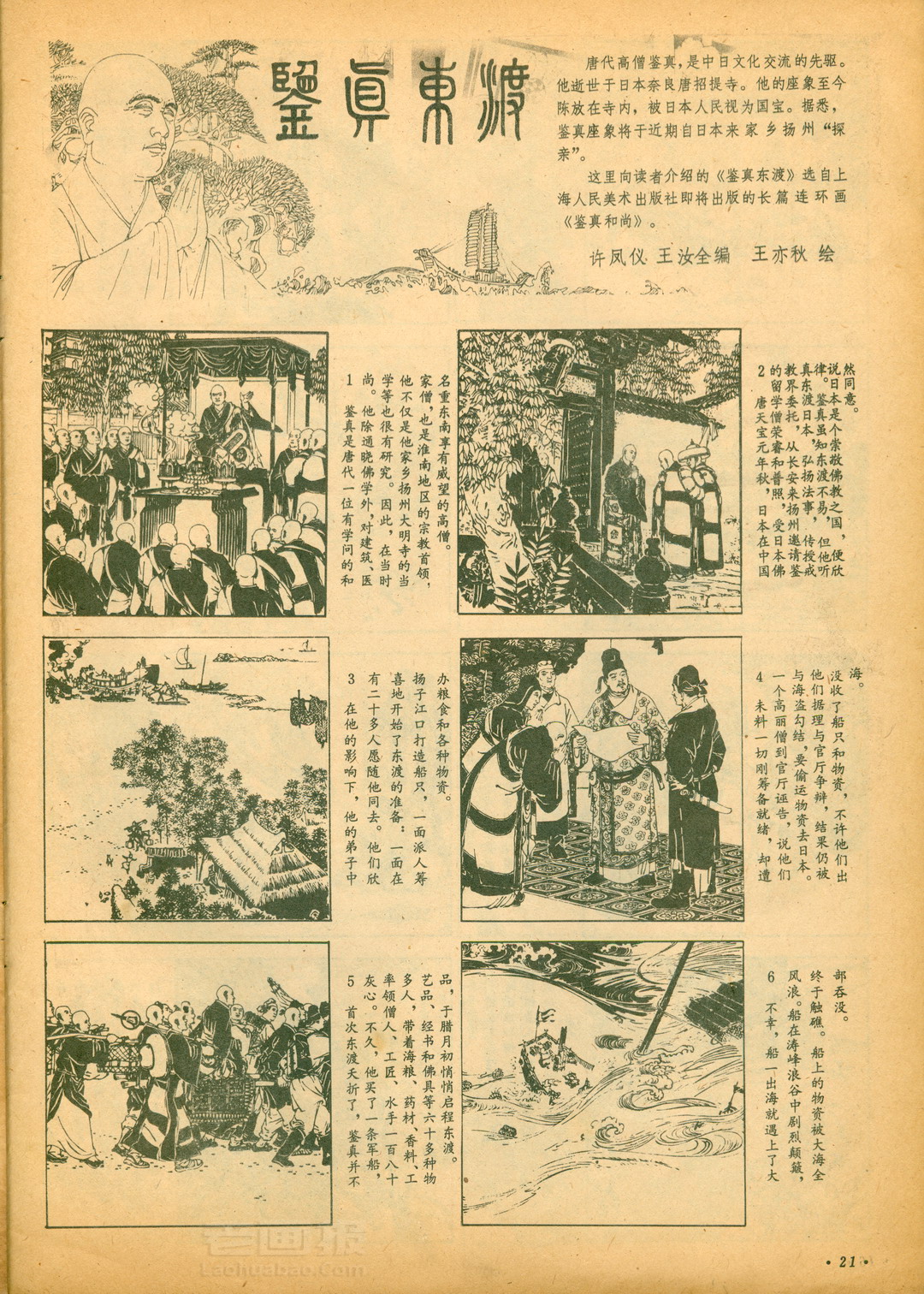 连环画 《鉴真东渡》 编文:许凤仪,王汝金 绘画:王亦秋 连环画报 1979年第9期 老画报网藏书扫描制作 转载请注明出处 唐代高僧鉴真,是中日文化交流的先驱。他逝世于日本奈良唐招提寺。他的座象至今陈放在寺内,被日本人民视为国宝。据悉,鉴真座象将于近期自日本来 家 乡扬州“探亲”。 这里向读者介绍的《鉴真东渡》选自上海人民美术出版社即将出版的长篇连环画《鉴真和尚》。 1 2 3 4 5 目录 |<< < 上一页 下一页 > >>| 鉴真东渡 < 上一页下一页 >