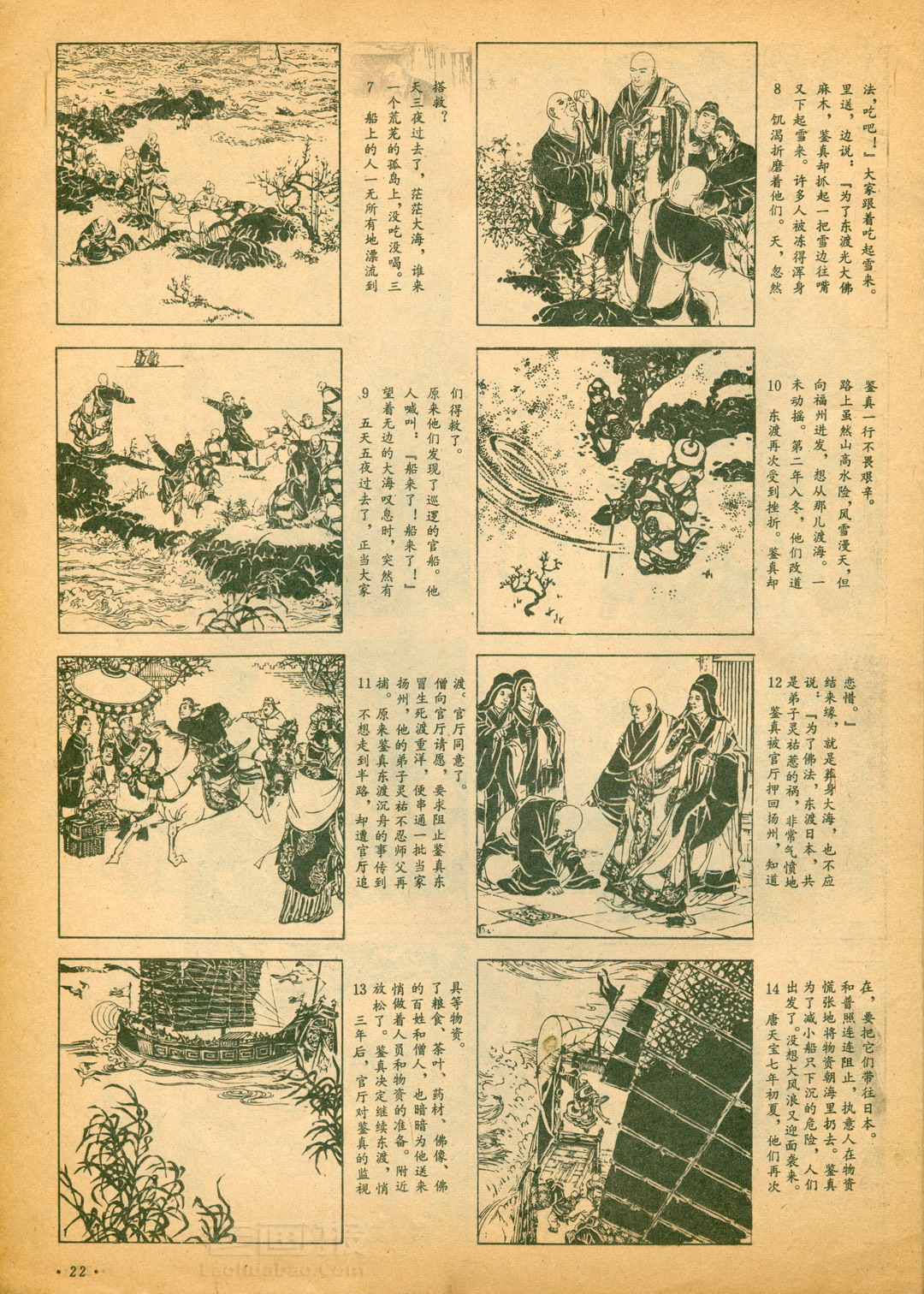 连环画 《鉴真东渡》 第2页 编文:许凤仪,王汝金 绘画:王亦秋 连环画报 1979年第9期 老画报网藏书扫描制作 转载请注明出处 唐代高僧鉴真,是中日文化交流的先驱。他逝世于日本奈良唐招提寺。他的座象至今陈放在寺内,被日本人民视为国宝。据悉,鉴真座象将于近期自日本来 家 乡扬州“探亲”。 这里向读者介绍的《鉴真东渡》选自上海人民美术出版社即将出版的长篇连环画《鉴真和尚》。 1 2 3 4 5 目录 |<< < 上一页 下一页 > >>| 鉴真东渡 < 上一页下一页 >