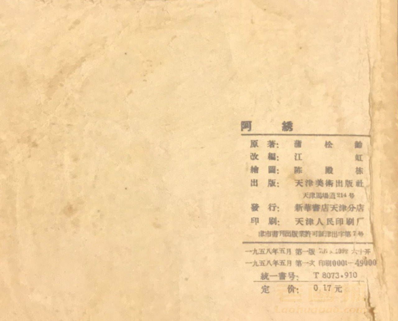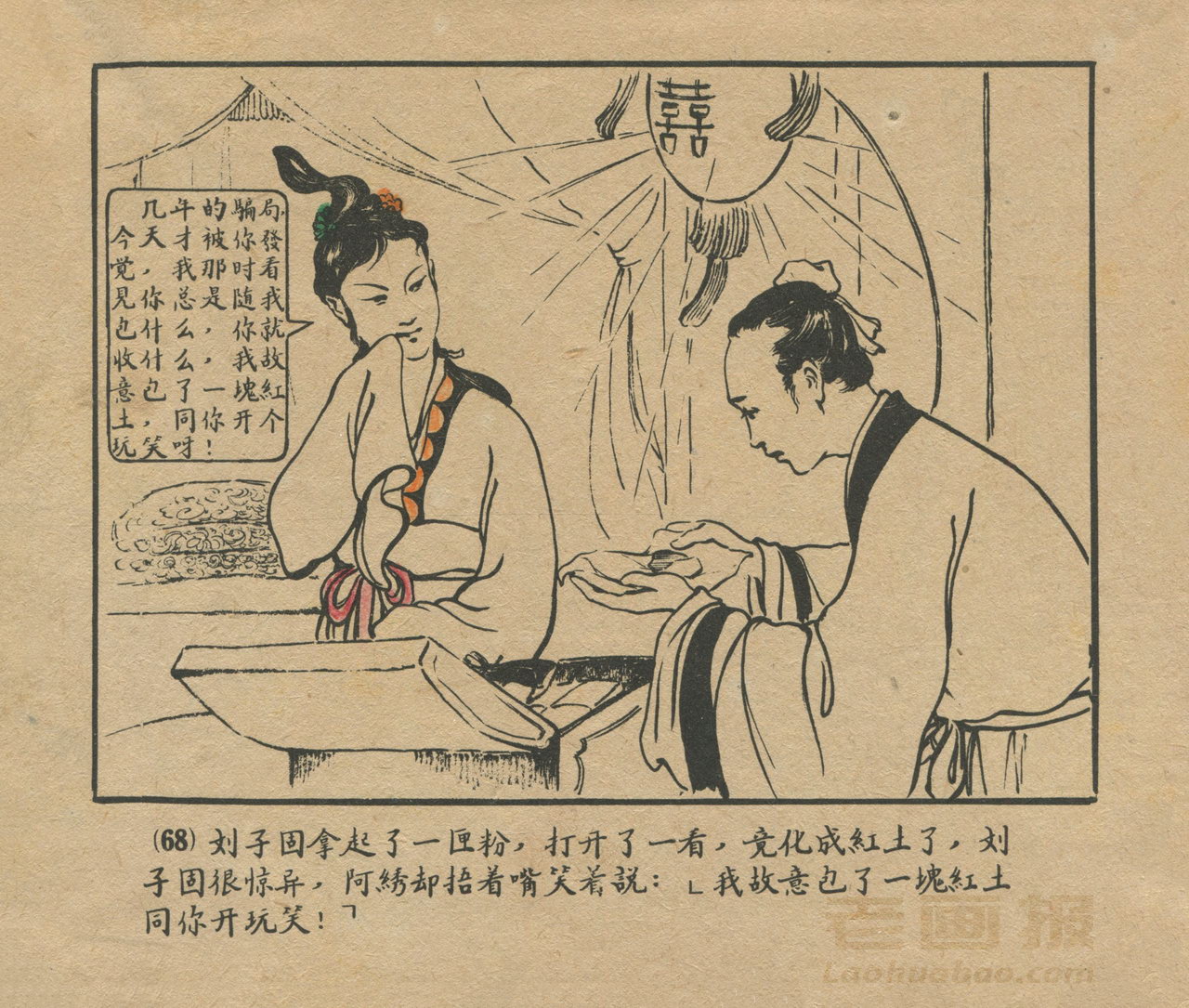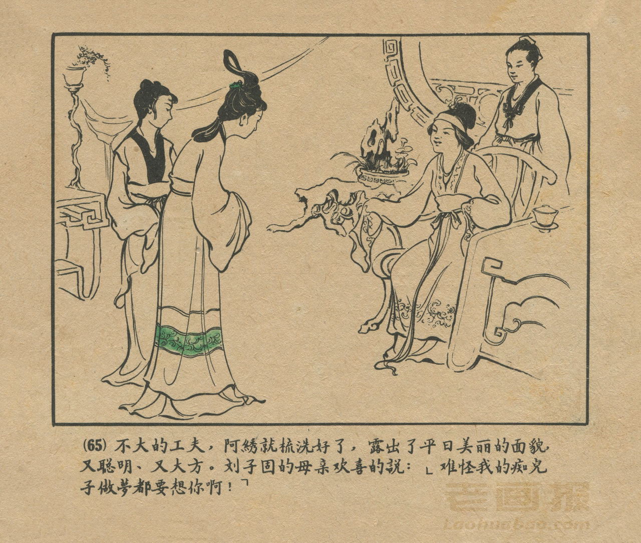 连环画《阿绣》 1958老版聊斋故事 第5页 原著:蒲松龄 编文:江虹 绘画:陈殿栋 天津美术出版社 1958 此连环画来源于连友“一步”藏书扫描,同意老画报网站免费发布不做商用。您可以自由分享、引用,但必须署名原作者,并不得用于商业目的。 1 2 3 4 5 目录 |<< < 上一页 下一页 > >>| 阿绣 共5页 < 上一页下一页 >