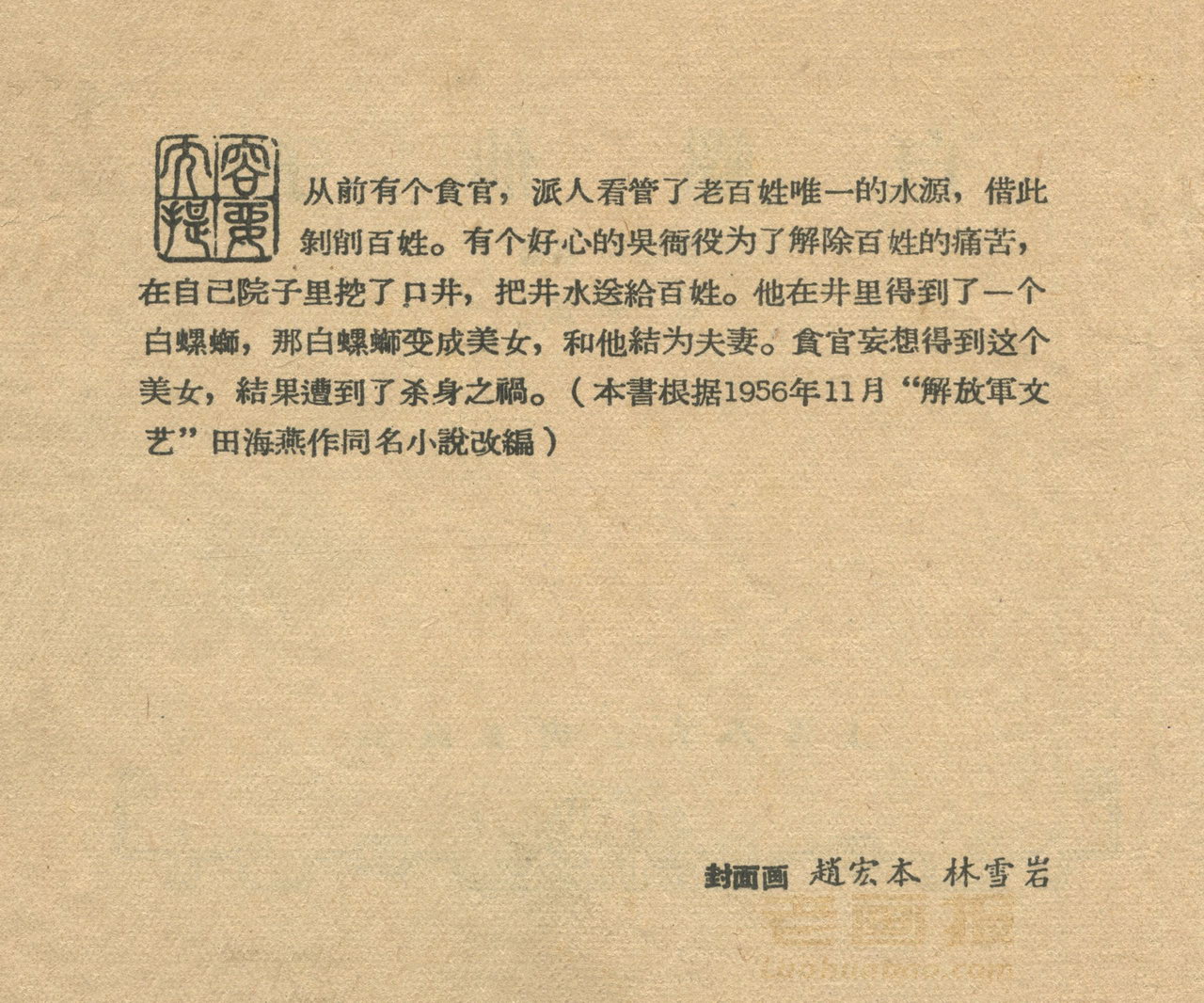 连环画《白螺仙子》 1959老版 原著:田海燕 编文:吉志西 绘画:吕品 上海人民美术出版社 1959 此连环画来源于连友“一步”藏书扫描,同意老画报网站免费发布不做商用。您可以自由分享、引用,但必须署名原作者,并不得用于商业目的。 1 2 3 4 5 目录 |<< < 上一页 下一页 > >>| 白螺仙子 共5页 < 上一页下一页 >