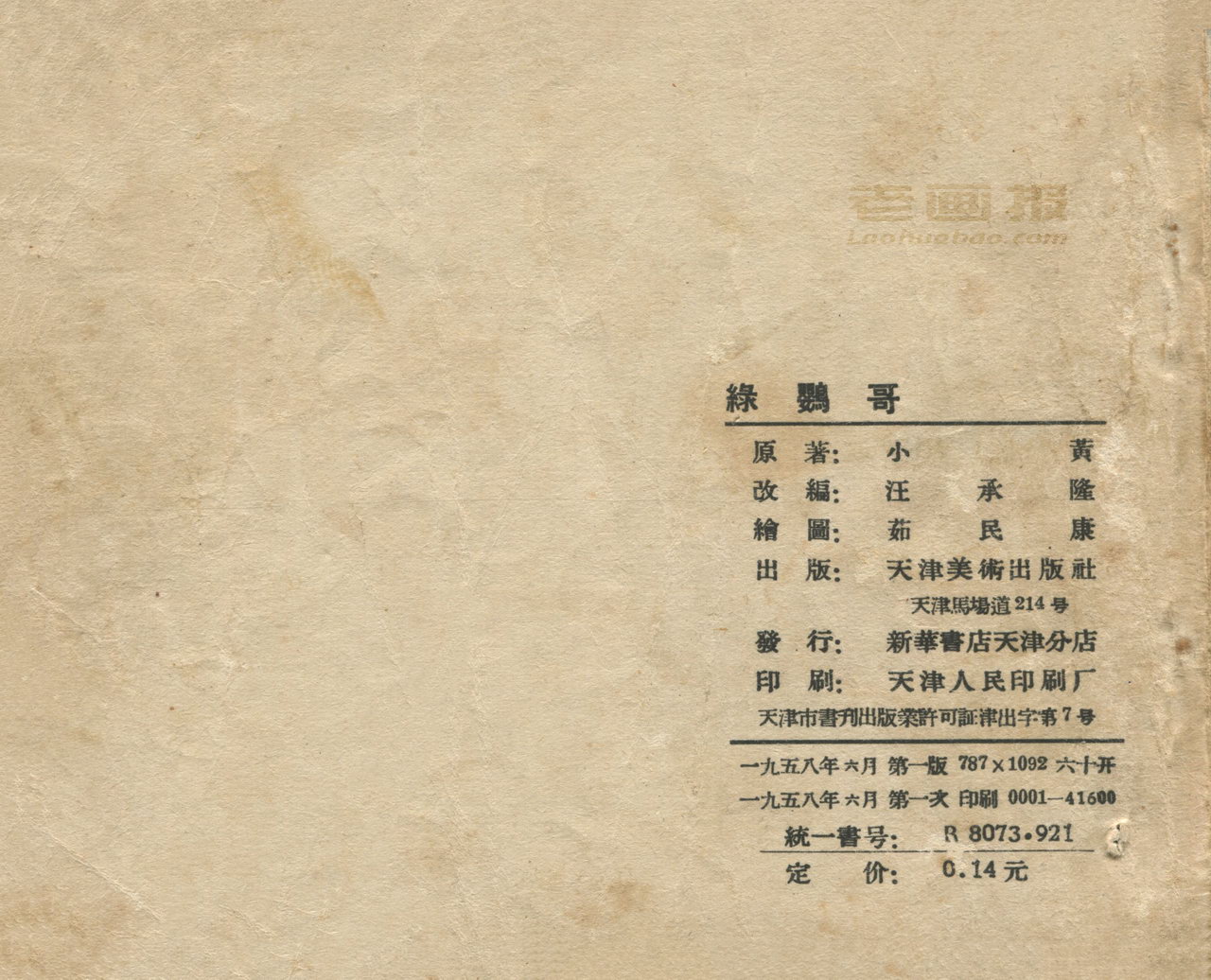 连环画《绿鹦哥》 1958老版 第4页 原著:小黄 编文:王承隆 绘画:茹民康 天津美术出版社 1958 此连环画来源于连友“一步”藏书扫描,同意老画报网站免费发布。您可以自由分享、引用,但必须署名原作者,并不得用于商业目的。 1 2 3 4 目录 |<< < 上一页 下一页 > >>| 绿鹦哥 共4页 < 上一页下一页 >