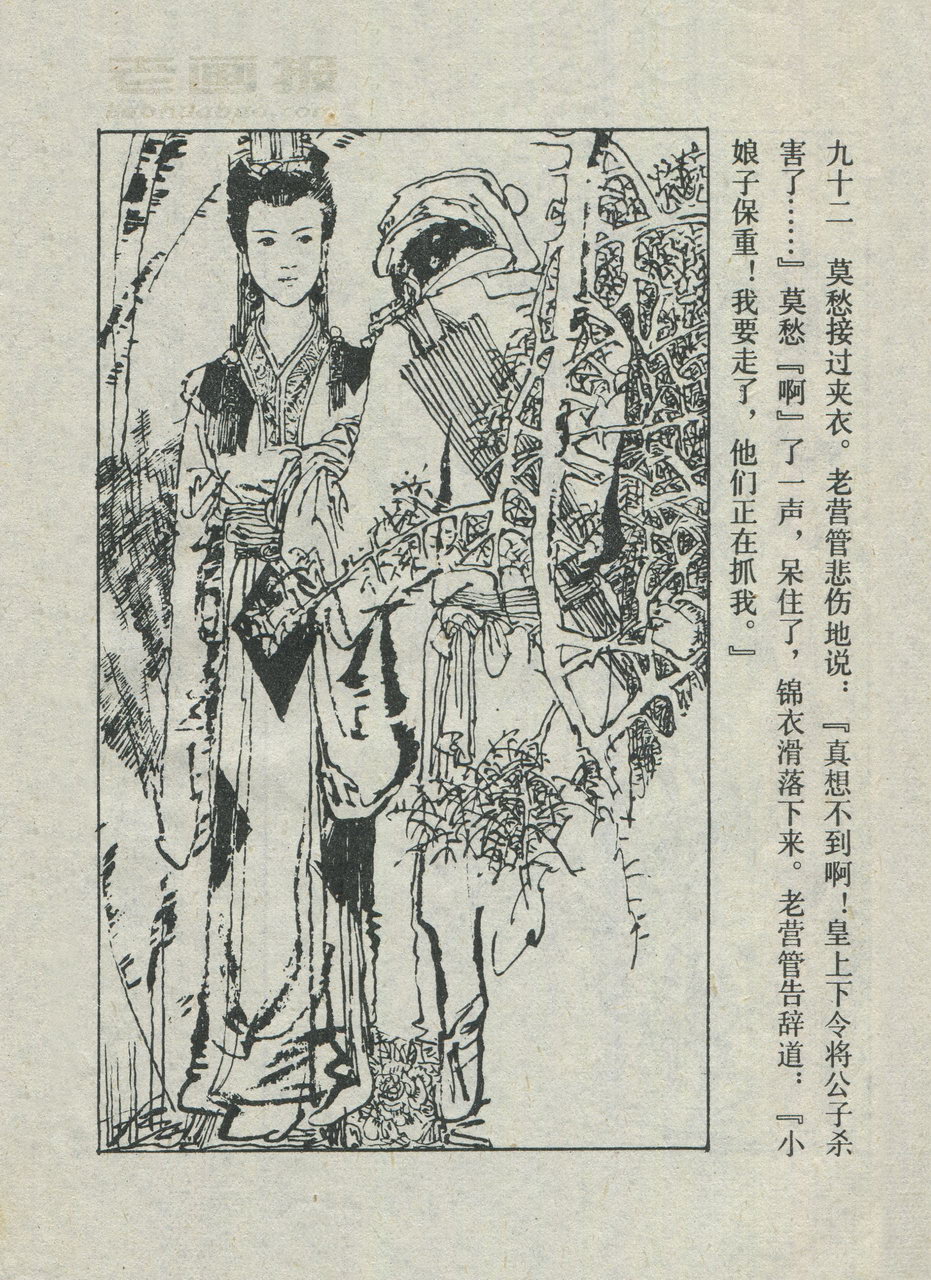 连环画《莫愁女》 1983老版 第6页 根据同名电影剧本 编文:袁海廷 绘画:吴绪经 漓江出版社 1983 此连环画来源于连友“一步”藏书扫描,同意老画报网站免费发布。您可以自由分享、引用,但必须署名原作者,并不得用于商业目的。 1 2 3 4 5 6 7 目录 |<< < 上一页 下一页 > >>| 莫愁女 共7页 < 上一页下一页 >