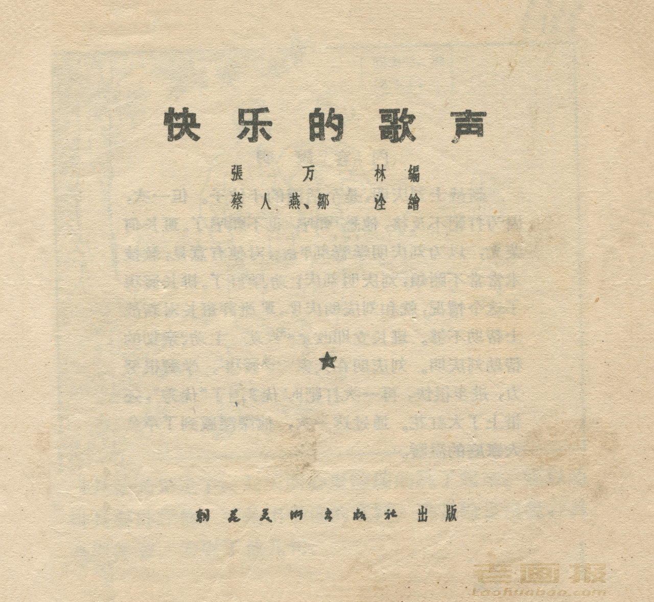 连环画《快乐的歌声》 1957老版 编文:张万林 绘画:蔡人燕 邬洤 朝花美术出版社 1957 此连环画来源于连友“一步”藏书扫描,同意老画报网站免费发布。您可以自由分享、引用,但必须署名原作者,并不得用于商业目的。 1 2 3 4 目录 |<< < 上一页 下一页 > >>| 快乐的歌声 共4页 < 上一页下一页 >