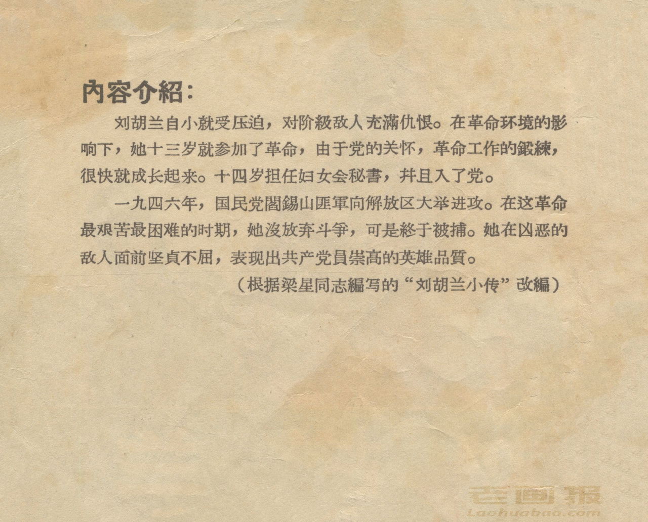 连环画《刘胡兰》 1958老版 根据梁星编写“刘胡兰小传” 绘画:姬寿彭 辽宁画报社 1958 此连环画来源于连友“一步”藏书扫描,同意老画报网站免费发布。您可以自由分享、引用,但必须署名原作者,并不得用于商业目的。 1 2 3 4 目录 |<< < 上一页 下一页 > >>| 刘胡兰 共4页 < 上一页下一页 >