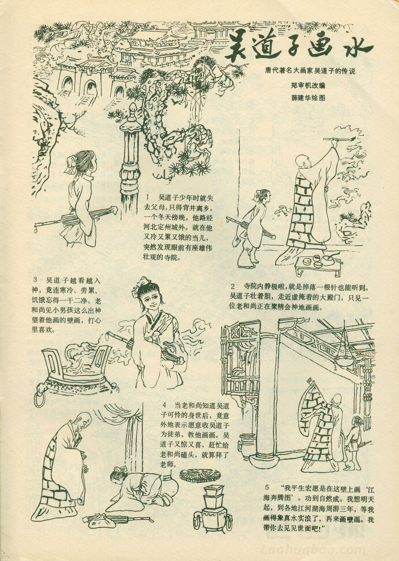 连环画 《吴道子画水》 唐代著名大画家吴道子的传说 编文:郑审机 绘画:薛建华 万花筒画报 1984年第5期 老画报网藏书扫描制作 转载请注明出处 1 2 3 目录 |<< < 上一页 下一页 > >>| 吴道子画水 唐代著名大画家吴道子的传说 < 上一页下一页 >