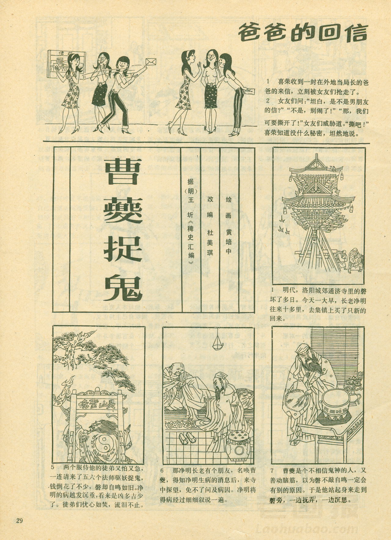 连环画 《曹夔捉鬼》 原著:(明)王圻《稗史汇编》 编文:杜美琪 绘画:黄培中 万花筒连环画报 1987年第11期 老画报网藏书扫描制作 转载请注明出处 1 2 3 目录 |<< < 上一页 下一页 > >>| 曹夔捉鬼 < 上一页下一页 >
