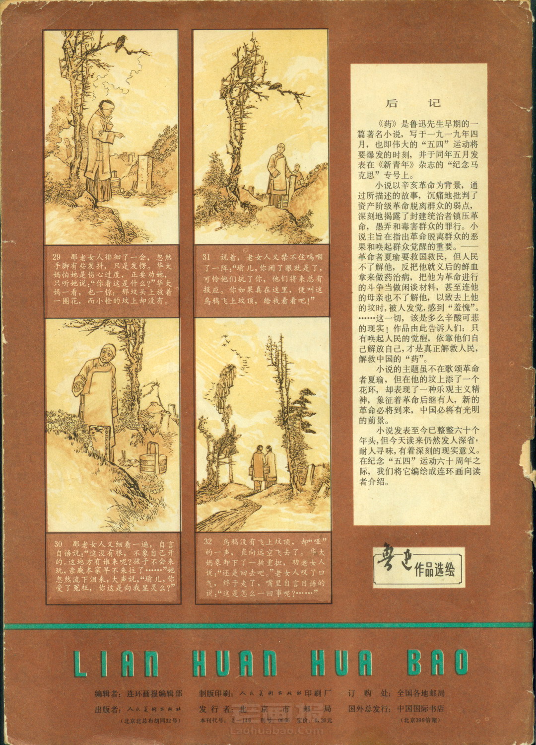 连环画 《药》 第6页 原著:鲁迅 编文:吴其柔 绘画:韩和平,郑家声 连环画报 1979年第5期 老画报网藏书扫描制作 转载请注明出处 《药》是鲁迅先生早期的一篇著名小说,写于一九一九年四月,也即伟大的“五四”运动将要爆发的时刻,并于同年五月发表在《新青年》杂志的“纪念马克思”专号上。 1 2 3 4 5 6 目录 |<< < 上一页 下一页 > >>| 药 < 上一页下一页 >