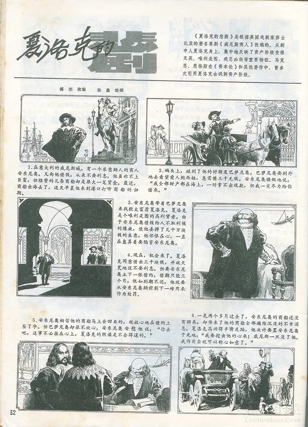 连环画 《夏洛克的悲剧》 原著:[英]莎士比亚 编文:傅杰 绘画:孙愚 工农兵画报 1979年第3期 老画报网藏书扫描制作 转载请注明出处 1 2 3 4 目录 |<< < 上一页 下一页 > >>| 夏洛克的悲剧 < 上一页下一页 >