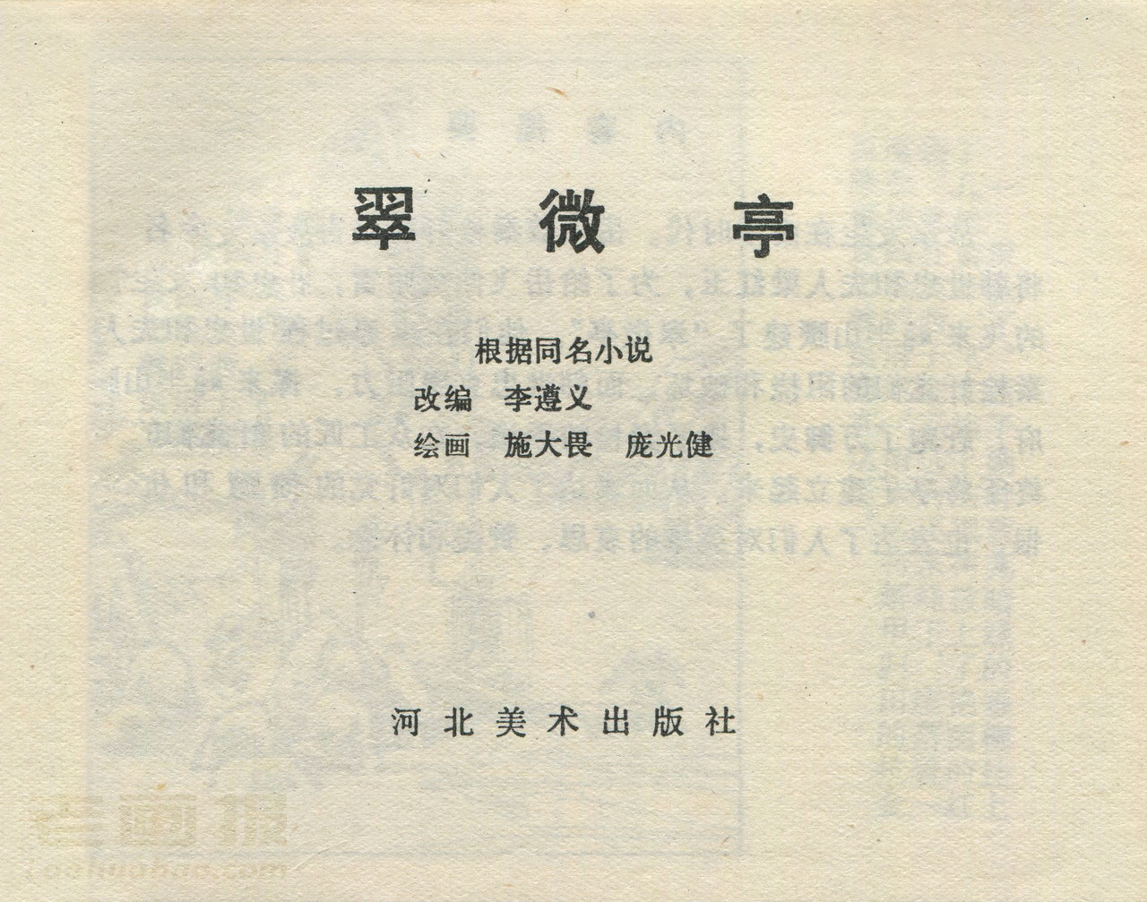 连环画《翠微亭》 1983老版 编文:李遵义 绘画:施大畏 庞先健 河北美术出版社 1983 此连环画来源于连友“一步”藏书扫描,同意老画报网站免费发布不做商用。您可以自由分享、引用,但必须署名原作者,并不得用于商业目的。 1 2 3 4 5 6 目录 |<< < 上一页 下一页 > >>| 翠微亭 共6页 < 上一页下一页 >