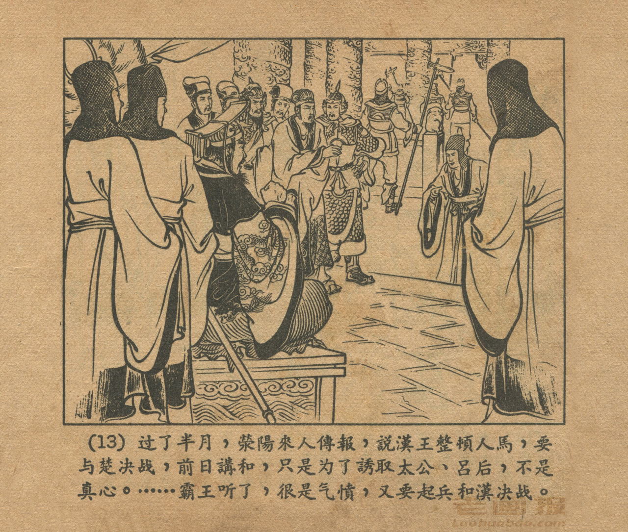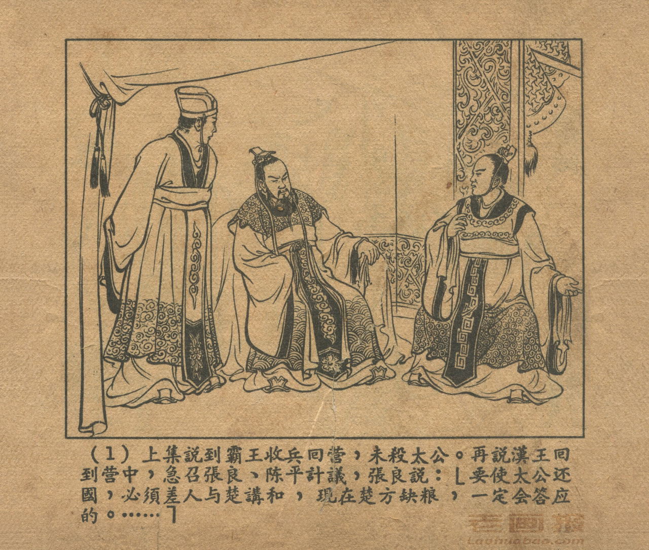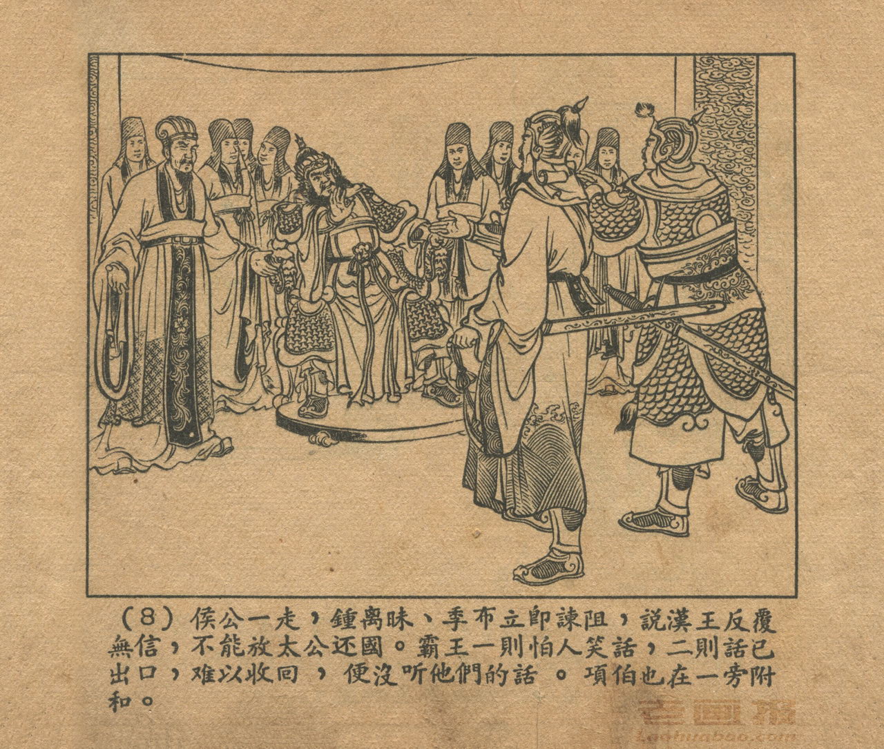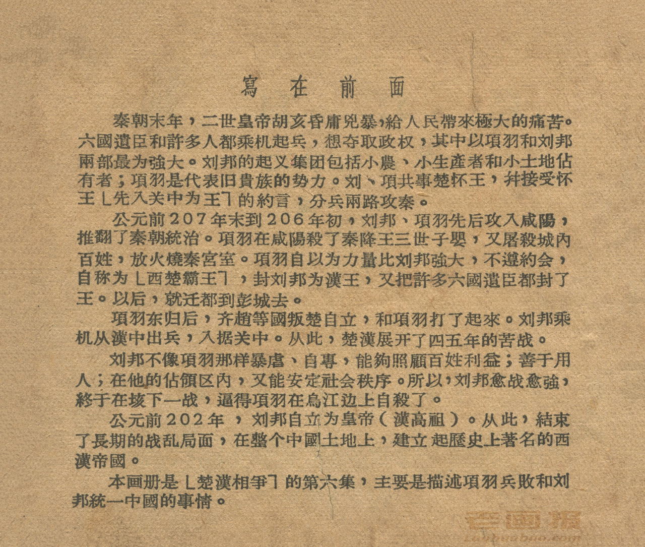 连环画《乌江自刎》 1958老版楚汉相争 编文:林林 绘画:李成勋 戴仁 上海人民美术出版社 1958 此连环画来源于连友“一步”藏书扫描,同意老画报网站免费发布。您可以自由分享、引用,但必须署名原作者,并不得用于商业目的。 1 2 3 4 5 6 7 8 9 目录 |<< < 上一页 下一页 > >>| 乌江自刎 共9页 < 上一页下一页 >
