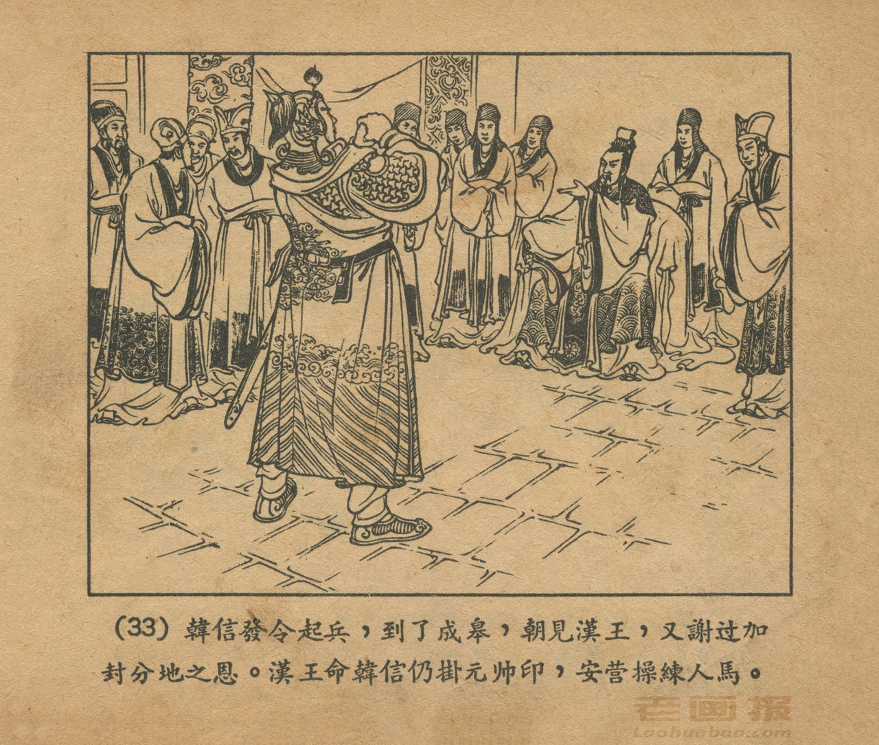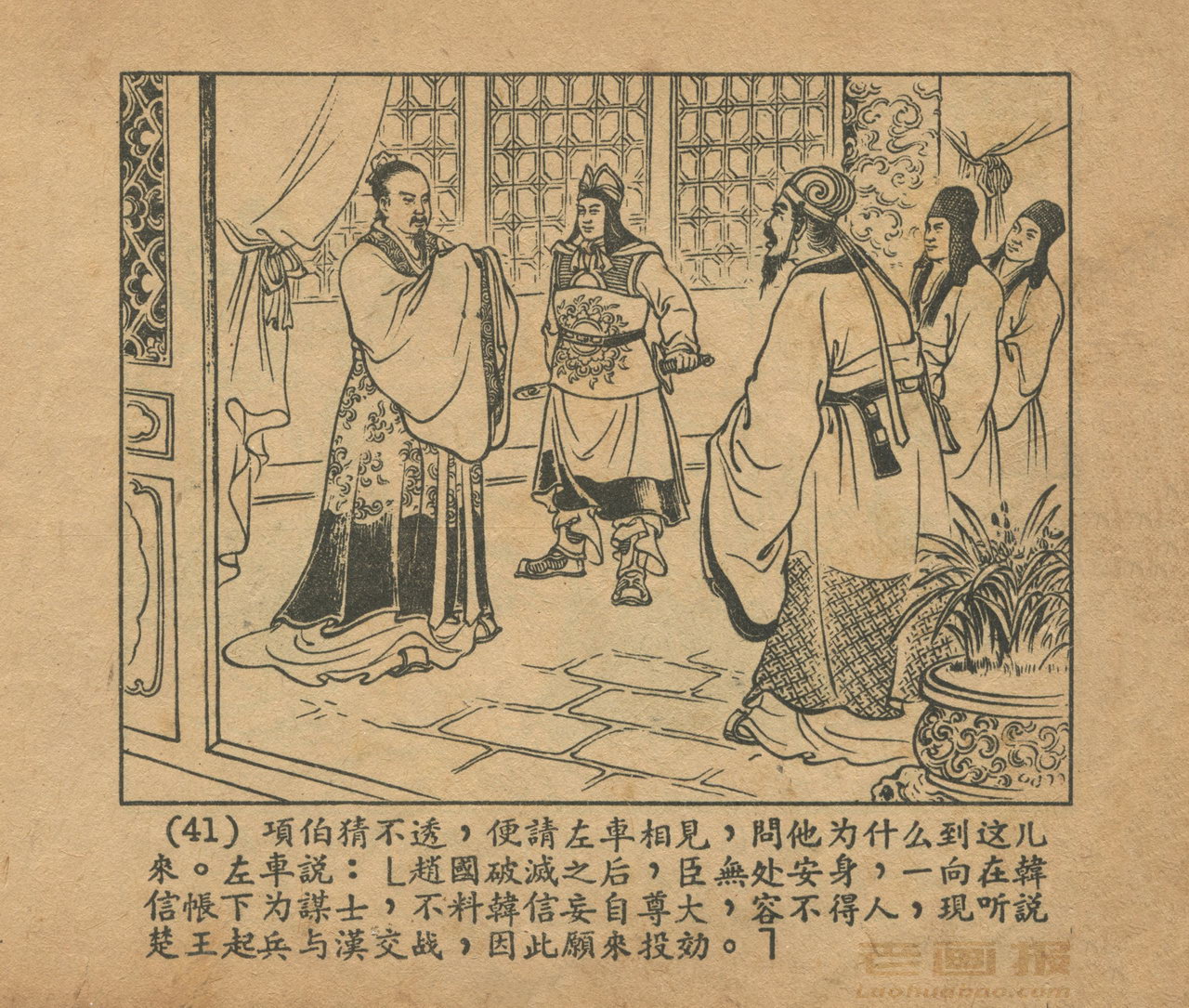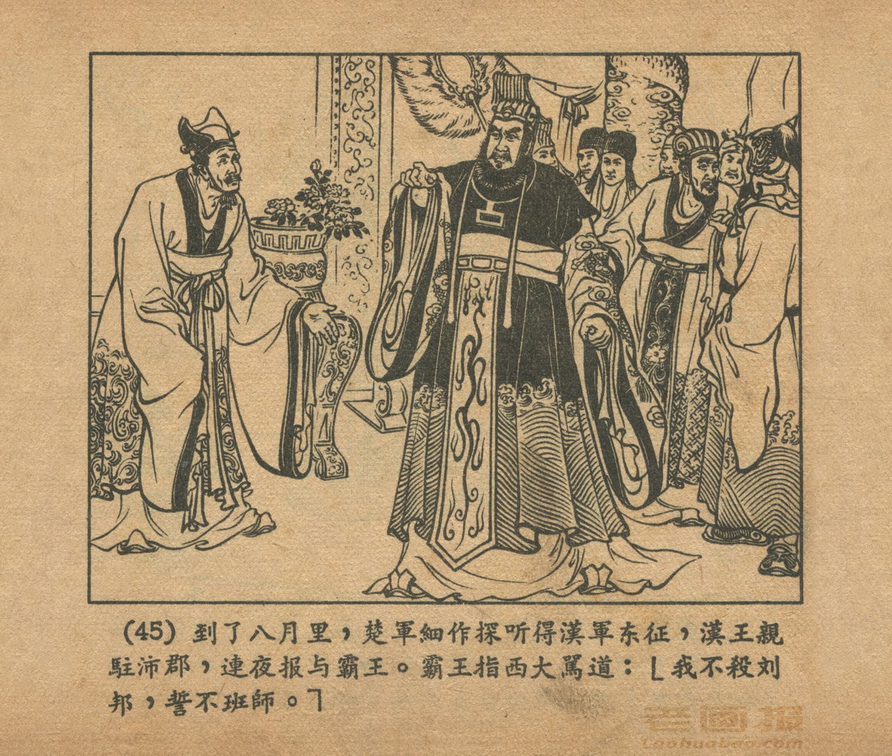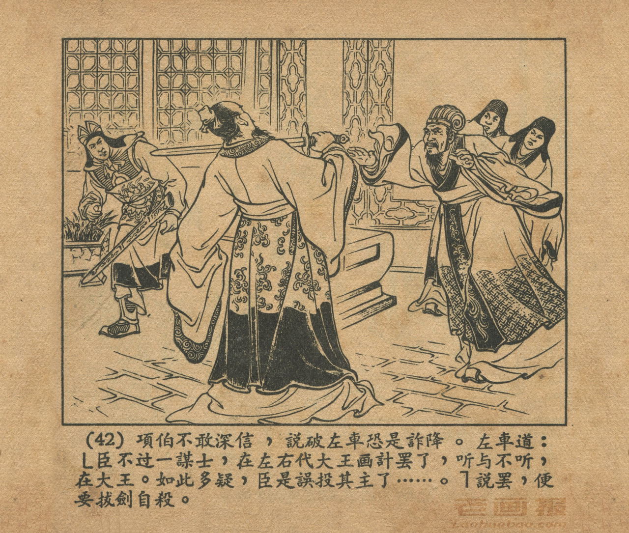 连环画《乌江自刎》 1958老版楚汉相争 第3页 编文:林林 绘画:李成勋 戴仁 上海人民美术出版社 1958 此连环画来源于连友“一步”藏书扫描,同意老画报网站免费发布。您可以自由分享、引用,但必须署名原作者,并不得用于商业目的。 1 2 3 4 5 6 7 8 9 目录 |<< < 上一页 下一页 > >>| 乌江自刎 共9页 < 上一页下一页 >
