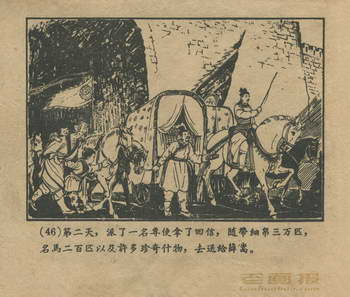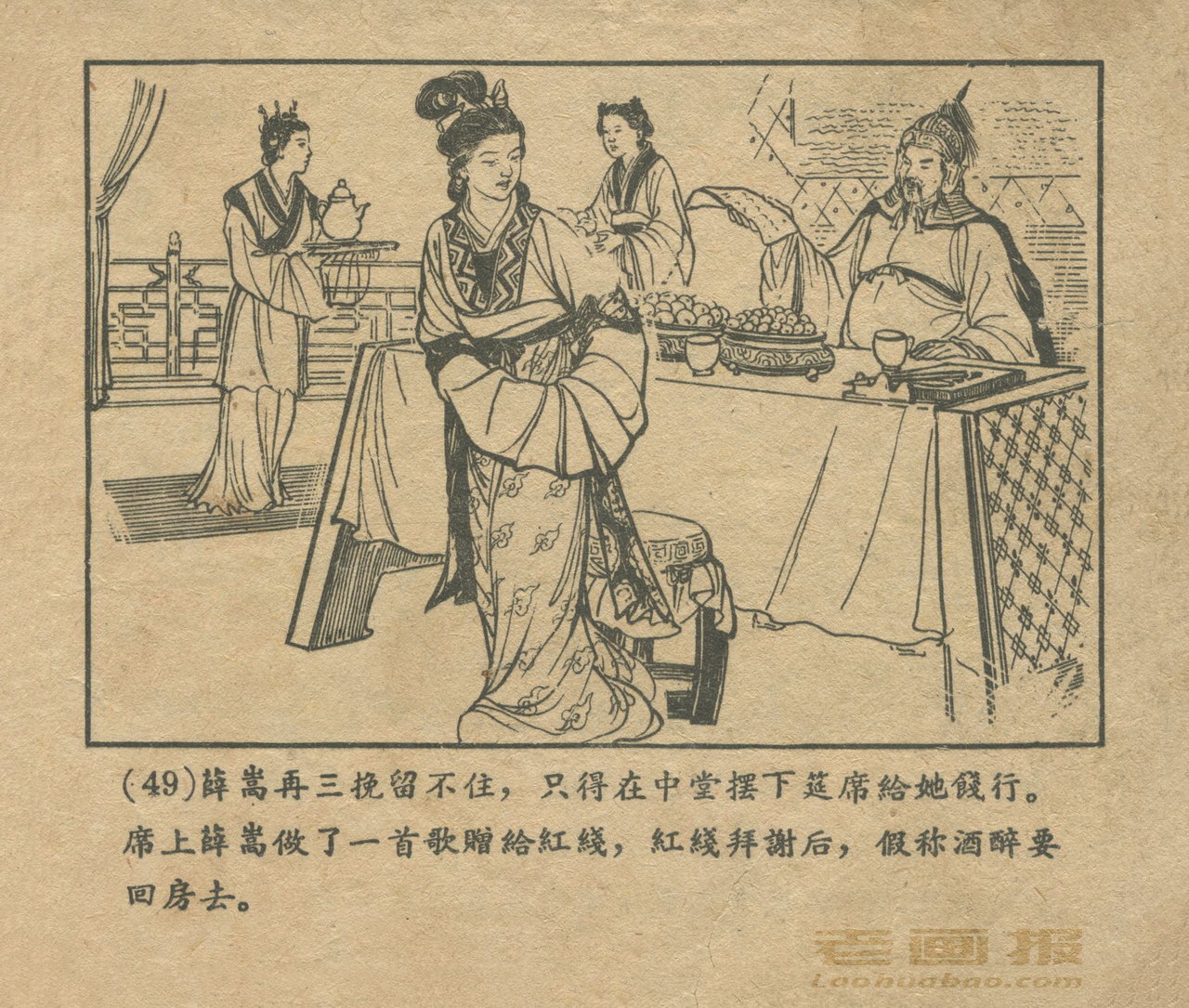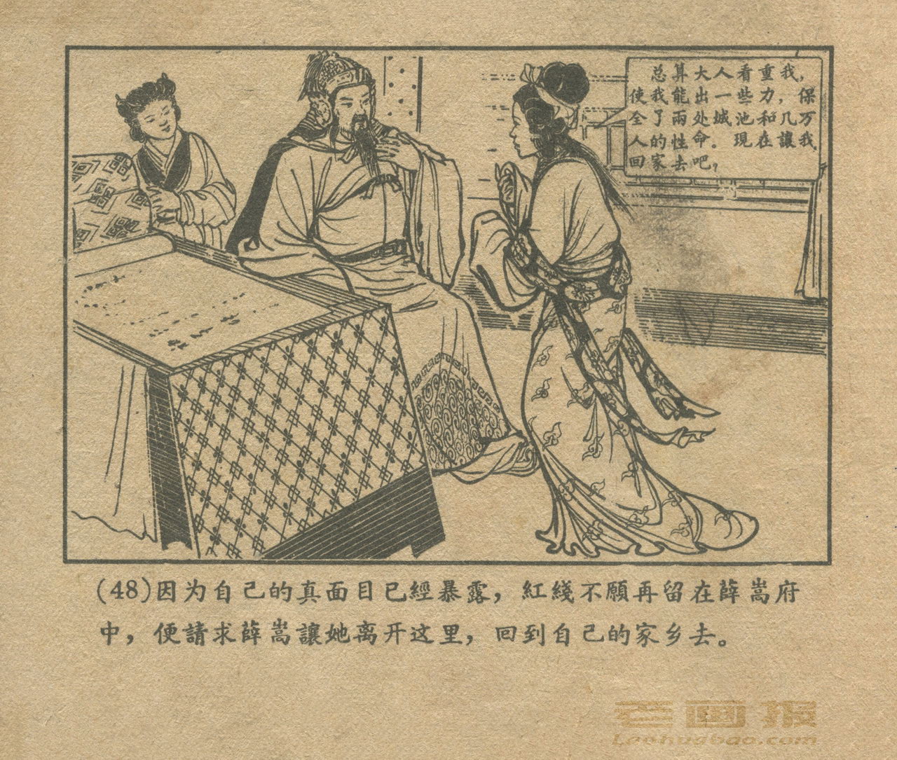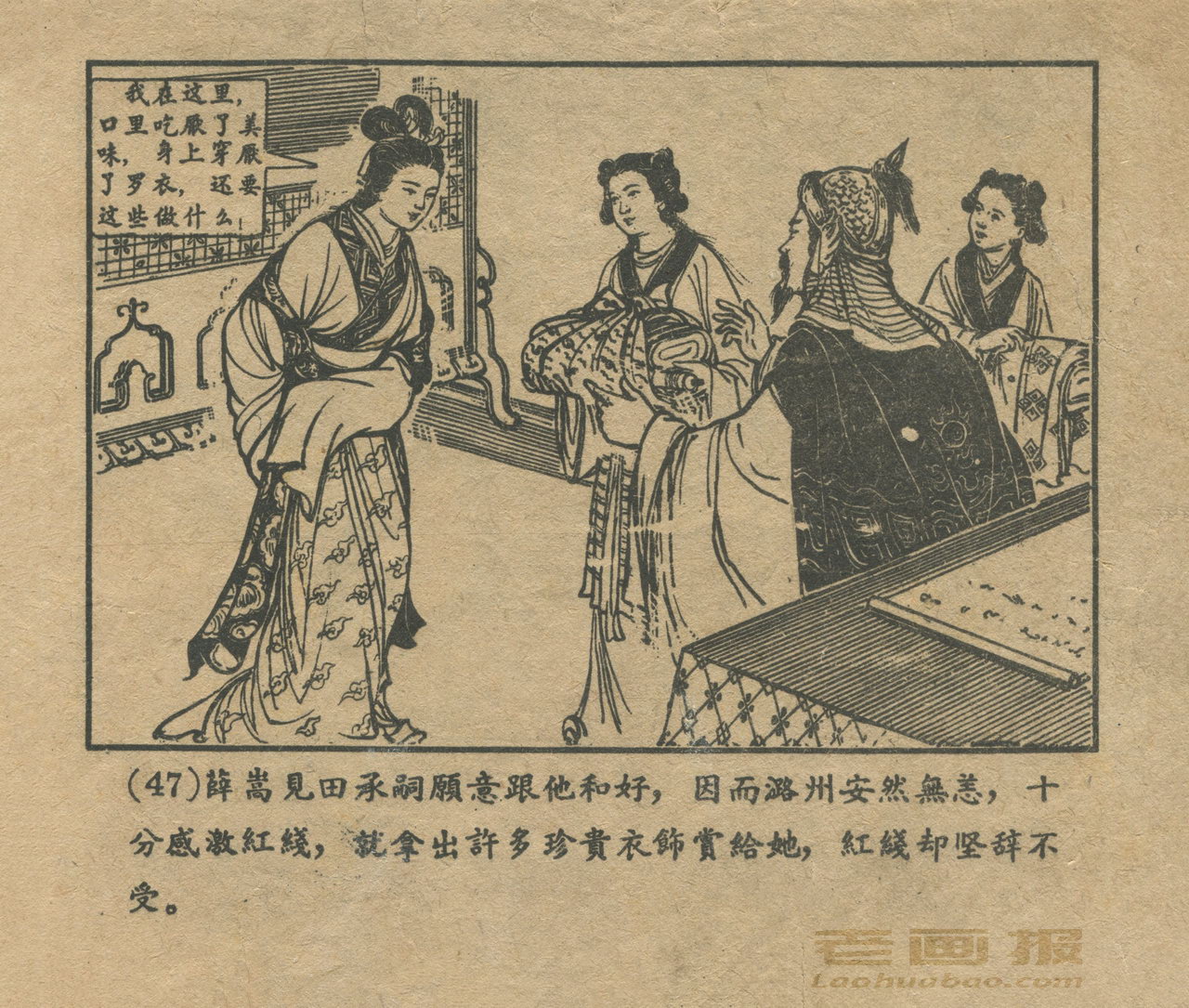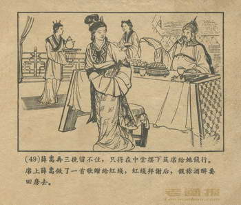 连环画《红线盗盒》 1958老版 第4页 编文:杨犀 绘画:黄子希 天津美术出版社 1958 此连环画来源于连友“一步”藏书扫描,同意老画报网站免费发布。您可以自由分享、引用,但必须署名原作者,并不得用于商业目的。 1 2 3 4 目录 |<< < 上一页 下一页 > >>| 红线盗盒 共4页 < 上一页下一页 >