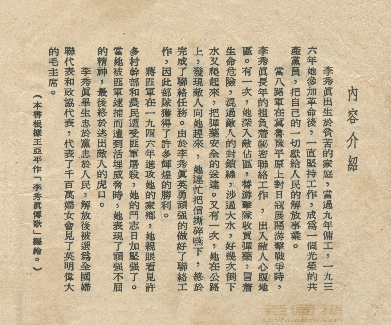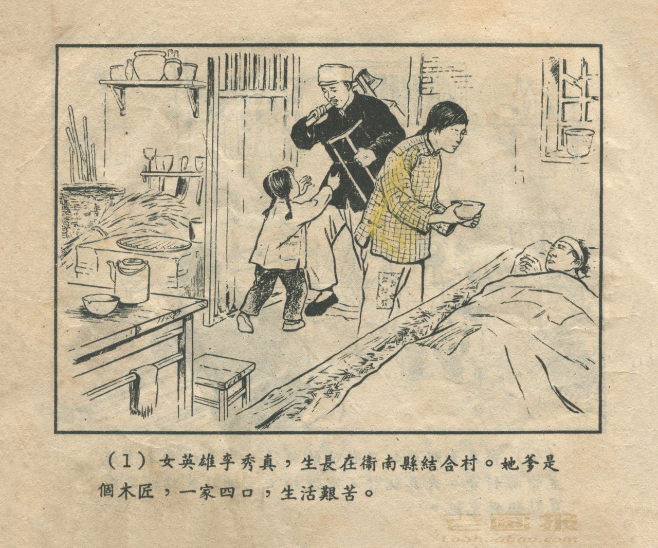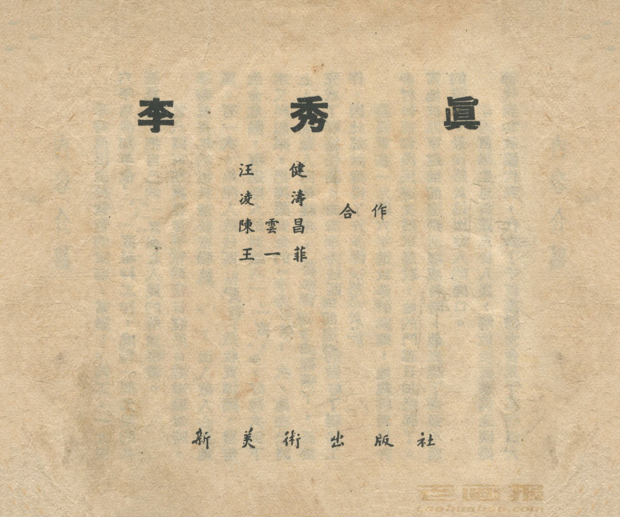 连环画《李秀真》 1953老版 绘画:汪健 凌涛 陈云昌 王一菲 新美术出版社 1953 此连环画来源于连友“一步”藏书扫描,同意老画报网站免费发布。您可以自由分享、引用,但必须署名原作者,并不得用于商业目的。 1 2 3 4 5 6 目录 |<< < 上一页 下一页 > >>| 李秀真 共6页 < 上一页下一页 >